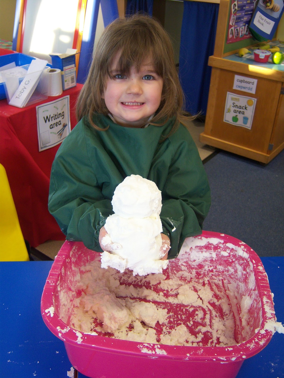 This week the Nursery children had fun making snow for Penguin! We used cornflour and shaving foam. It felt very soft and we even managed to build a snowman with it!